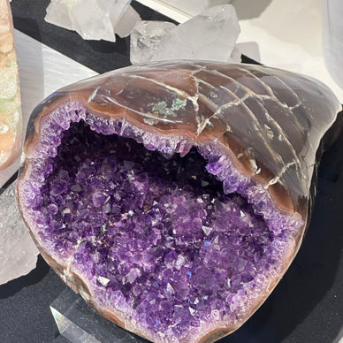 紫晶簇的能量場非常強大,可謂生生不息。紫晶簇是在地底下經過千萬年,匯集了無數的磁波與磁場,具有改善陽宅及個人磁場的功能。紫晶簇能改善風水,作為家宅或辦公室的風水石,有聚氣聚財、驅邪避凶的作用。